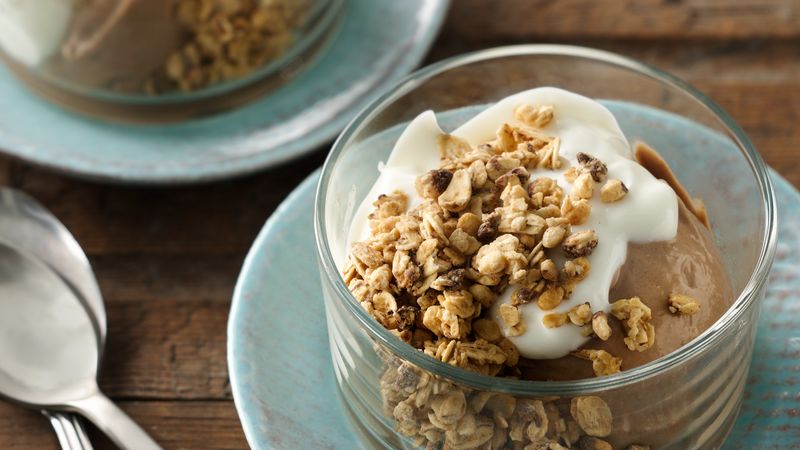 - Разпределете в чаши, изсипете кисело мляко отгоре и поръсете печени мюсли.
