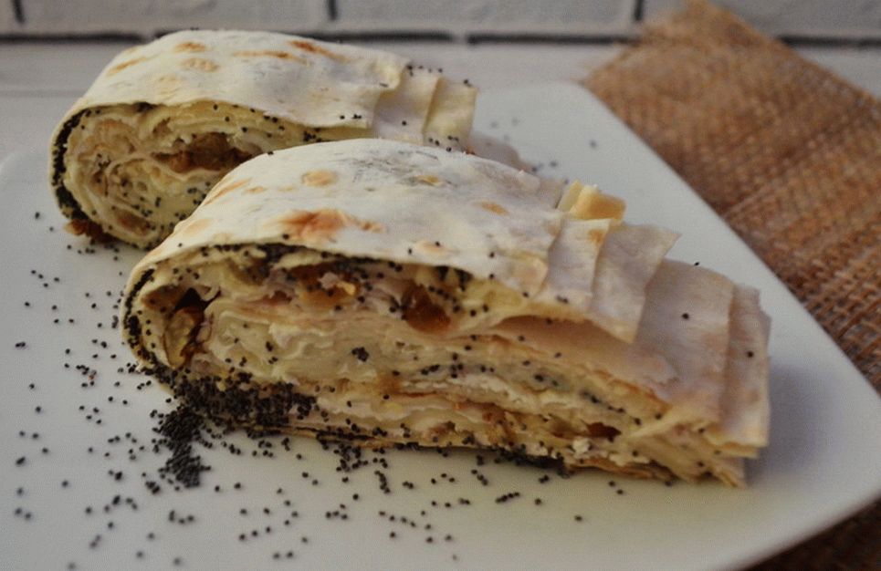 - Нарязваме пита питата на четири правоъгълника със същия размер. Разреждаме меда в 100 мл вода. Разстиламе пита хляб върху фолио, мазнина меден сироп, поръсете с макови семена.