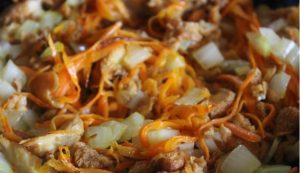 - Запържете лука и морковите в отделен тиган, докато мекота.