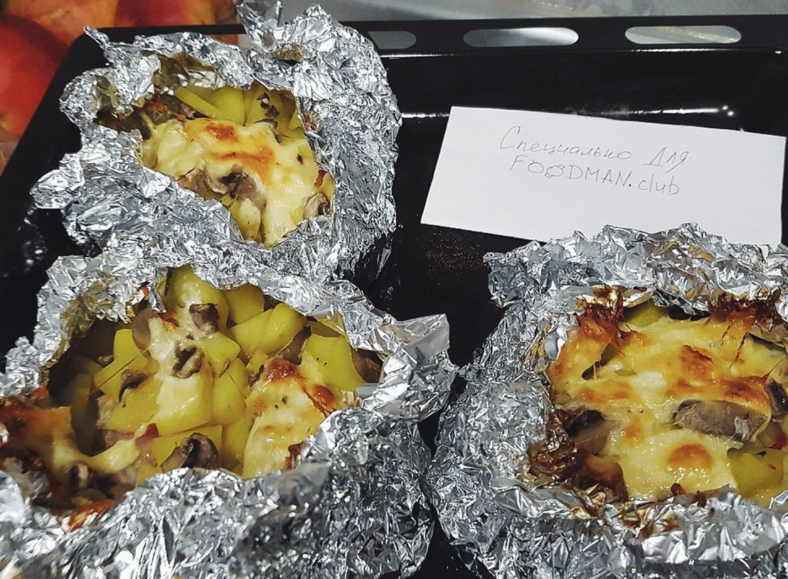 - Разстелете върху фолиото с разрез, така че след това напълно обвивка: – месо – лук – домати – картофи – гъби – сирене.