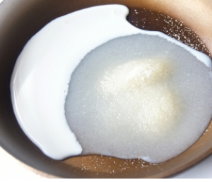 - Изсипете мляко в купа и сложете захар в него.