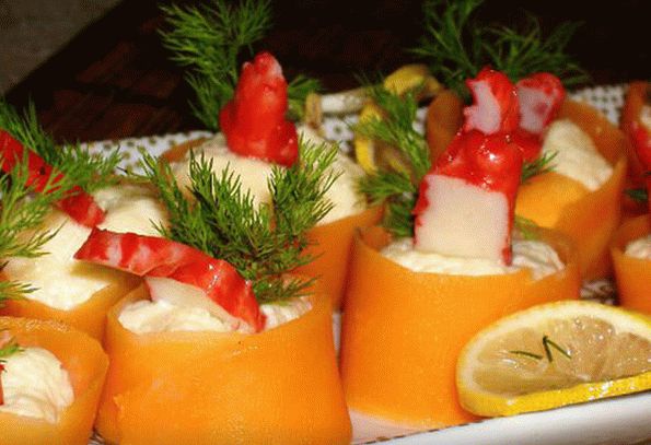 - Увийте топките с ивици моркови, поставете върху всяко руло раци или обелени скариди, гарнирайте с билки.