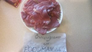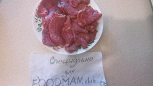 - Нарязваме месото с пържоли, не много гъсти, около 1-1,5 cm. Разбийте, сол, черен пипер и добавете подправки.