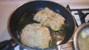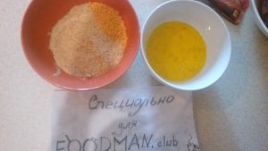 - В тиган загрейте растителното масло. Използвах зехтин. Потопете пържола в този ред яйца крекери-яйца крекери. Слагаме го в тиган и пържим по 4-5 минути от всяка страна.