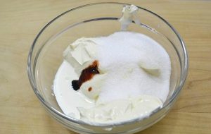 - В купа разбийте сиренето със заквасена сметана, захар и ванилия.
