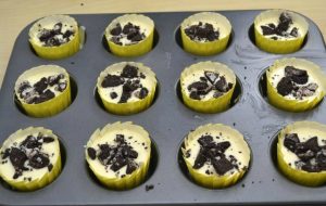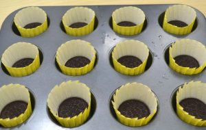 - Поставете хартиени чаши за печене в консервите и поставете бисквитки във всяка от тях.