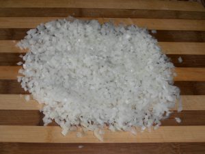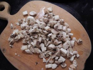 - В дълбок тиган с горещо олио запържете лука, след това добавете гъби. Запържете за 5 минути, така че цялата течност сварено.