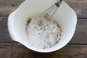 - Смесете брашното с кафе, захар, бакпулвер и щипка сол.