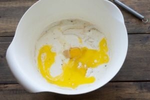 - Добавете разтопеното масло, млякото и яйцето. Разбийте с миксер.