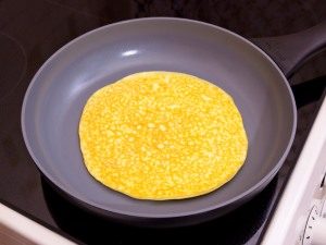 - Разбийте всяко яйце, добавете малко сол. Запържете палачинките с две страни, след което се нарязва на сламки.