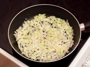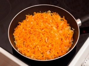- Запържете нарязан лук в тиган с растително масло, добавете към него морковите, настъргани на средна ренде, леко заедно СРЮ.
