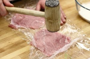 Парче свинско сладко се измива, изсушава с хартия кърпи, нарязани на парчета с дебелина 1-1,5 см. и едно по едно победи чрез прилепнал филм.
