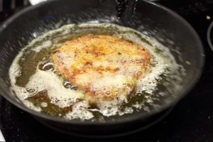 В сгорещено олио изпращаме порции от нарязаната панировка и запържете на среден огън от 2 страни за 4-5 минути, докато златисто кафяво.
