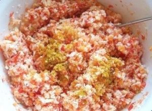 - Измиваме всички зеленчуци, обелваме и настъргваме. Към настърганите зеленчуци добавете захар, къри и сол.