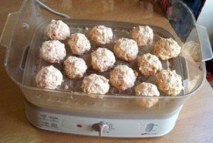 - Оформяме малки котлети с ръце и ги поставяме двоен бойлер.