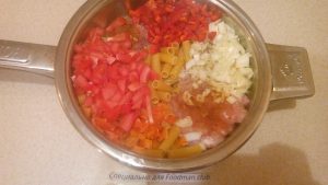 - Изсипете зехтин в тигана. Нарежете филетата и зеленчуците сложете на кубчета и напълнете с вода, добавете сол, черен пипер и затворете капака.