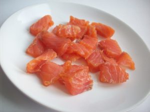 Пушена сьомга за изчистване на кожите. Отстранете гръбначната кост и премахнете максимално костите.