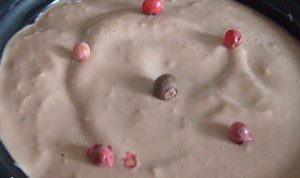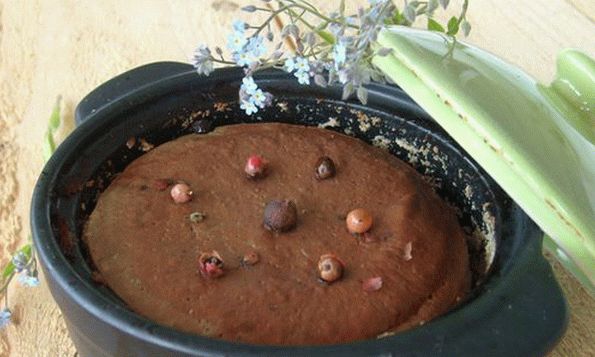 - Смажете керамичната форма с капака, сложете масата, гарнирайте с грах от розов пипер, покрийте, изпратете до фурна, предварително загрята до 190 градуса за половин час.