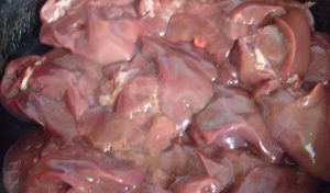 - Запържете подготвените парчета от черния дроб в олио за пет минути, като се разбърква.
