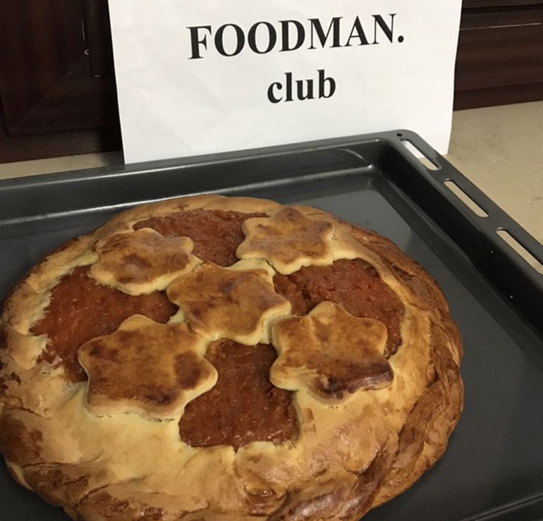 - Разделете тестото на 3 части. Разточете една част (най-големият), сложете върху тава за печене, намажете с пълнеж. втори част разточете, изрежете фигурите и затворете тортата. От третата част направете пигтейл и го сложете на пай. Оставете в това състояние пай за 40 минути.