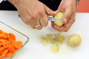 - Гответе картофите и морковите на кора. След това почистете зеленчуци и нарязани на филийки.