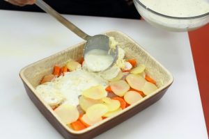 - Изсипете соса със зеленчуци и зеленчуци във фурната за 30 минути. Температурата във фурната трябва да е около 200 градуса.