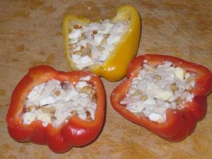 - Моят пипер, нарязан на половинки, както обикновено ядро със семена. Напълваме половинките чушки с пилешка маса с ядки.