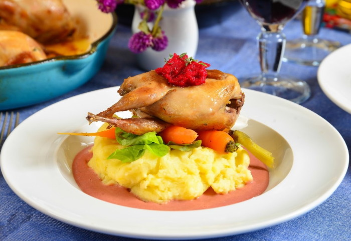 Изваждаме ароматна сочна пъдпъдъци и веднага сервираме с картофи картофено пюре, варени зеленчуци и любим сос.