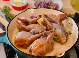 Пъдпъдъците ще се окажат сочни и вкусни, ако са преди това запържете в тиган със стръкчета мащерка и гответе у дома фурната. Гарнитура може да бъде картофено пюре.