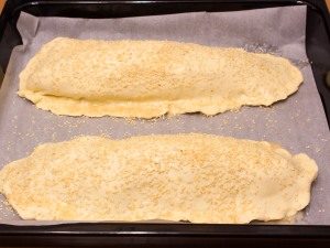 - Разделете тестото наполовина. На повърхност, поръсена с брашно разточете два слоя.