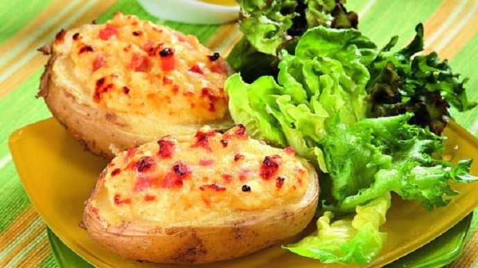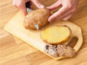 - Нарежете изпечените картофи наполовина, извадете пулпата. месо омесете с вилица.
