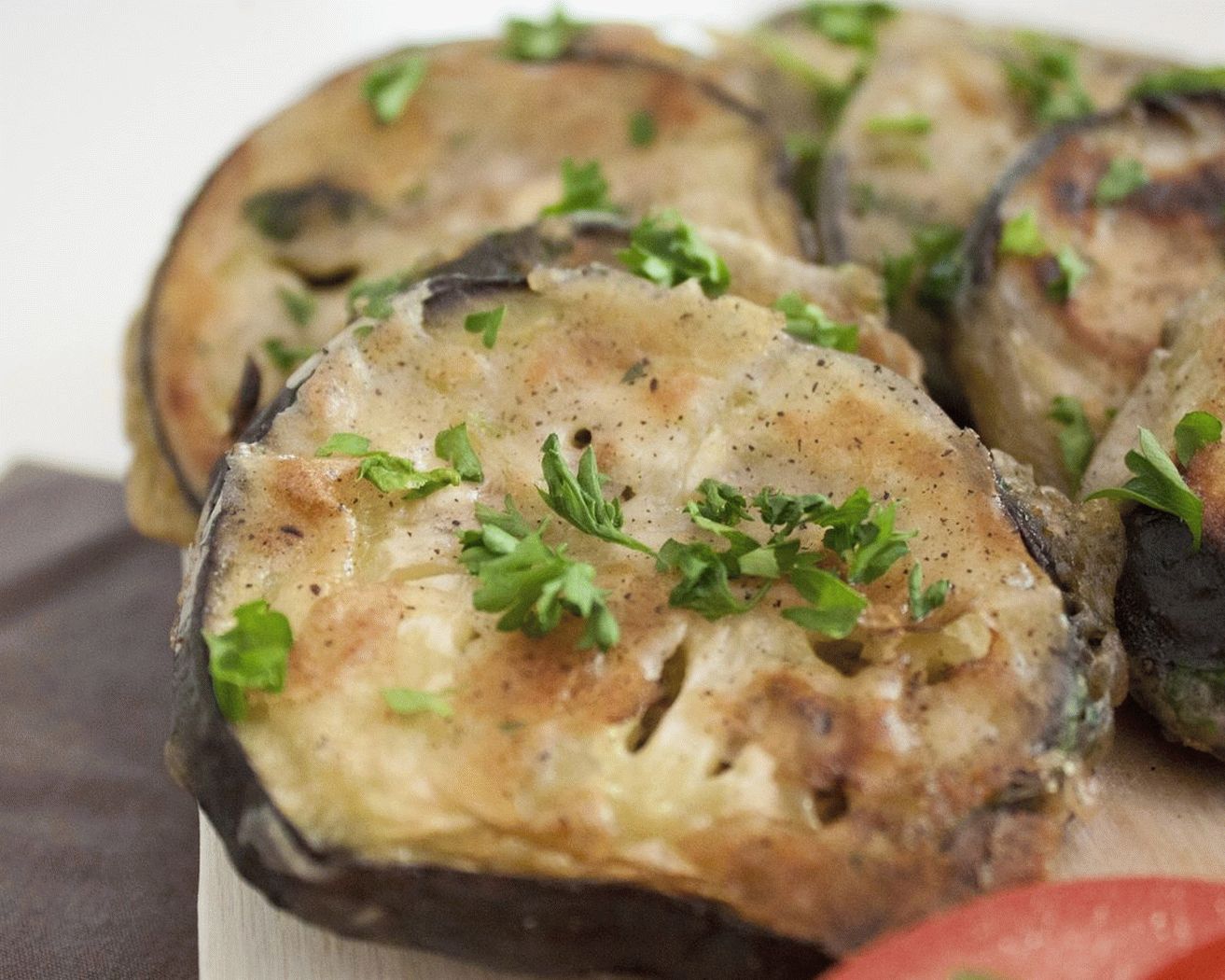 - Извадете патладжана, намажете с майонеза и чесън, поръсете отгоре настърган кашкавал. Сложете във фурната, докато сиренето започне да се разтопи.