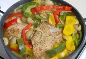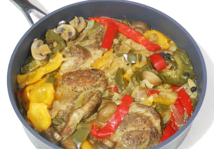 Сочни филийки свински врат, предварително пържени и задушени с чушки, праз, лук и шампионки. Ястието се приготвя у дома много просто, но задушено свинско със зеленчуци и гъбите са много вкусни! Придава специален вкус на ястието сушена мащерка и кориандър.