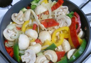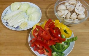 Пречистени от семена и мембрани чушки (за красота вземаме 3 цвята) с нарязайте праз на ивици, лук на половин пръстени, нарежете измитите гъби наполовина, нарежете чесъна през пресата.