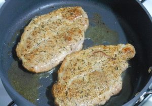 Измиваме парчета от свински врат, поръсваме с кориандър, мащерка, смлян черен пипер, сол и изпратете 2 бр. в горещо масло. Пържете на среден огън, докато леко покафенеят и отстранете чиния.