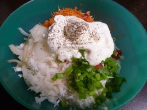 - Смесете всичко в купа и подправете със заквасена сметана. На вкус, сол и черен пипер.