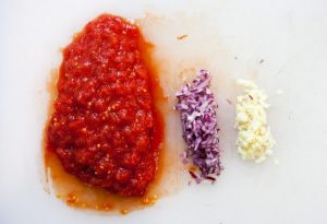 - Нарязваме консервираните домати с нож, нарязваме на ситно лука (20 г), също накълцайте ситно чесъна.