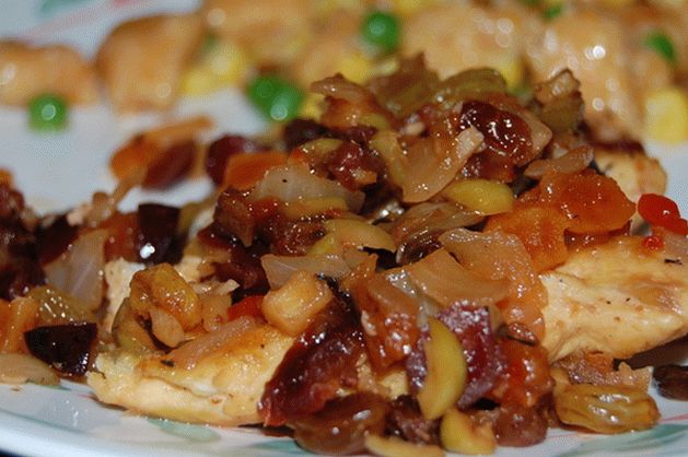 - Натрошете пилето на 8 части, сложете във формата, залейте със соса сушени плодове.