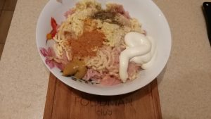 - Добавете майонезата, малко горчица, подправки, черен пипер и сол. Смесваме всичко.