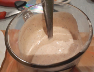 - Изсипете подправка за пиле, смлян червен пипер в заквасена сметана и сушени билки от Прованс. Разбъркайте до гладкост.