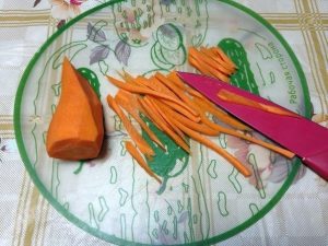- Обелете морковите и нарежете на ивици. Можете също така просто да търкате моркови на едро ренде.