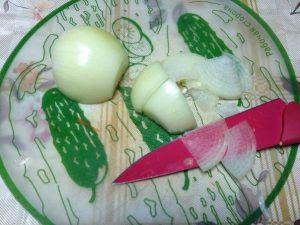 - Нарязваме лука на половин пръстени.
