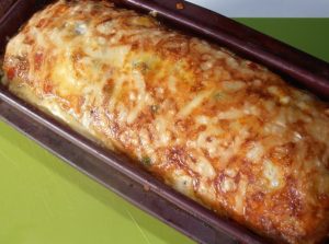 Намазнете дълбока тава за хляб с масло и разстелете сместа (2/3 части). Слагаме фурната на 180 градуса.