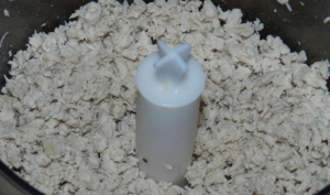 - Смелете предварително сварени пилешки гърди в блендер или през месомелачка.