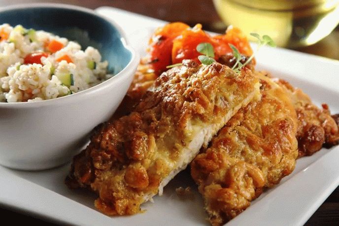 Много проста и бърза рецепта за готвене на вкусно пиле. Акцентът на ястието са царевичните люспи, които му придават необичаен вкус. Готвенето на домашно приготвено пиле е много просто, с дори неопитен готвач ще се справи с това. Отстрани правим ориз с зеленчуци.
