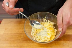 Настържете сирене и го сложете в купа, там трябва да добавите майонеза, корнфлейкс и сух чесън. Всички внимателно да се смеси.