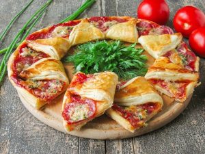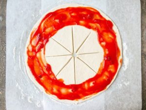 Оформяне на пица във формата на слънцето. Увийте краищата на триъгълниците, покривайки пълнежа и закрепете.
