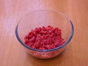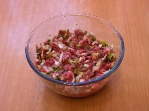 - Смелете говеждо месо чрез електрическа месомелачка, смесете с ситно нарязан лук и броколи, леко сол и черен пипер, разбъркайте добре.