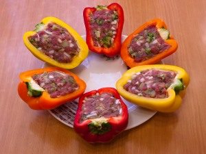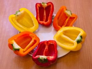 - Измийте чушките от различни цветове, нарежете заедно на половина, премахнете септума и семената.