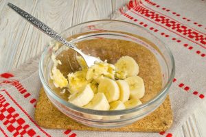 - Обелете бананите, нарежете на парчета и омесете с вилица до състояние на пюре.